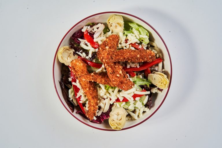 Panelenmiş Tavuk, Marul, Akdeniz Yeşillikleri, Köz Kapya Biber, Rende Mozerella, Enginar Kalbi, Hardal Vinegret Sos