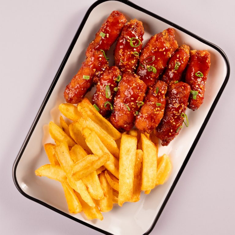 Barbekü Soslu Panelenmiş Tavuk Kanatları, Taze Soğan, Kavrulmuş Susam, Ranch Sos, Patates Kızartması