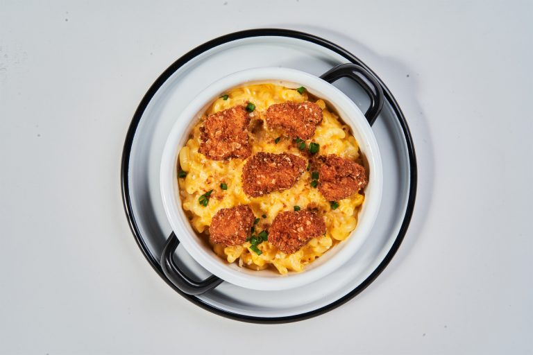 Cheddar peyniri,mozerella peyniri,parmesan peyniri soslu makarna ve Kızarmış tavuk parçaları