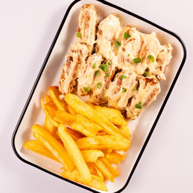 Ballı Hardal Soslu Panelenmiş Tavuk Kanatları, Taze Soğan, Ranch Sos, Patates Kızartması
